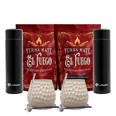 Yerba Mate-set voor twee: El Fuego 2x500g + 2x Thermos LED + 2x Kalebas + 2x Bombilla