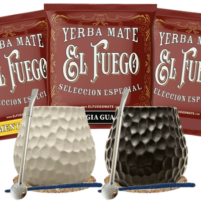 Yerba Mate-set voor twee: monsters El Fuego 3x50g + 2x Kalebas + 2x Bombilla