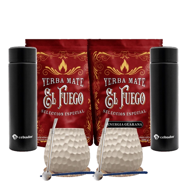Yerba Mate-set voor twee: El Fuego 2x500g + 2x Thermos LED + 2x Kalebas + 2x Bombilla