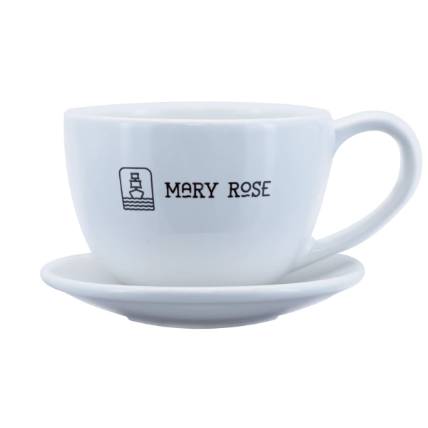 - Wit theekopje met Mary Rose logo met schoteltje.