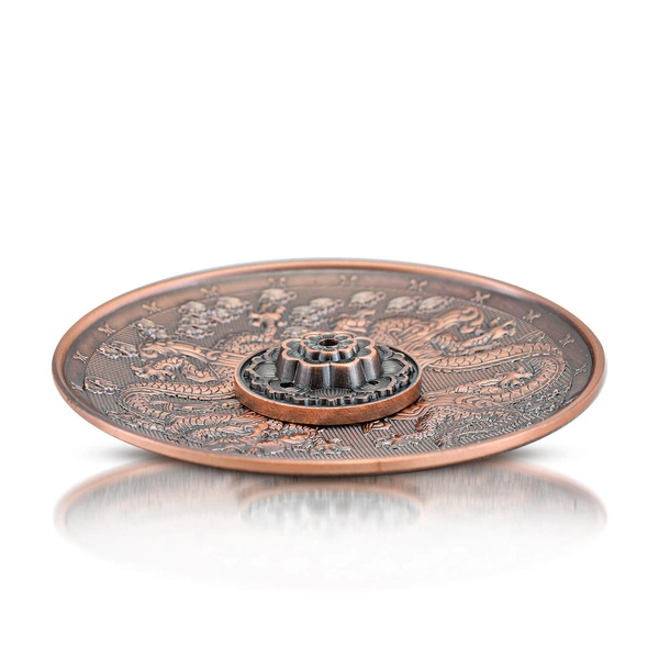 - "Draak" ronde wierookstokhouder / brander, gemaakt van een hoogwaardige zinklegering, in een Verre Oosten stijl. De twee draken die de houder versieren symboliseren kracht, macht, vertrouwen en moed.
