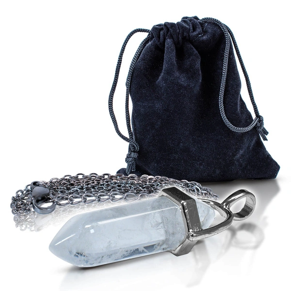 Vorm: geslepen bergkristal in een metalen frame (met ketting), verpakt in zwart zakje
