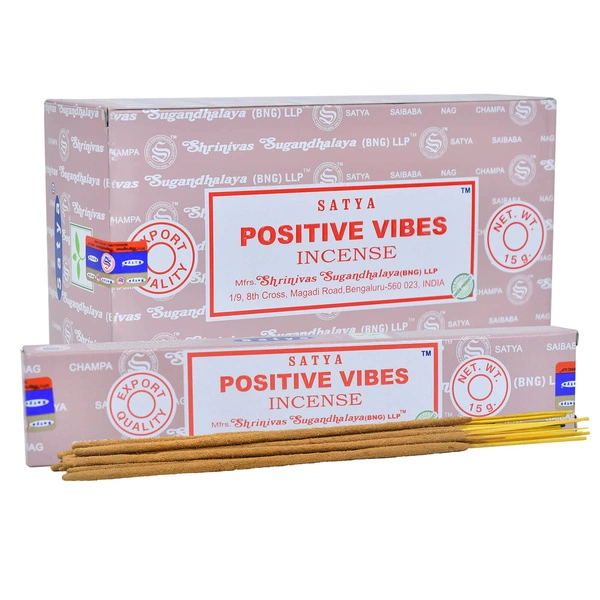 - Satya Positive Vibes wierook - met de hand gerolde Indiase wierookstokjes met een bloemig-bosachtig aroma. Ze kalmeren, reinigen en verhogen de vibratie. Ideaal voor meditatie, yoga en het creëren van een positieve sfeer thuis of op de werkplek.