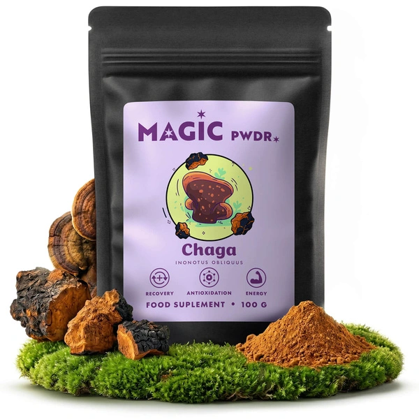 - Magic Pwdr Chaga is een 10:1-extract van de vruchtlichamen van de chaga-paddenstoel in poedervorm. Het heeft antioxiderende eigenschappen en ondersteunt de natuurlijke afweer van het lichaam.