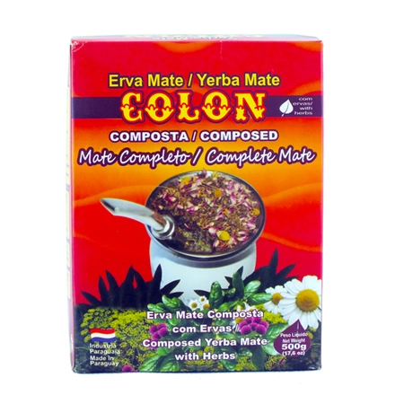 - Colón Compuesta Mate Completo 0,5 kg 500 g is een Paraguayaanse yerba mate met een verfrissende en stimulerende werking. De verpakking bevat zowel bladeren, takjes als stof.