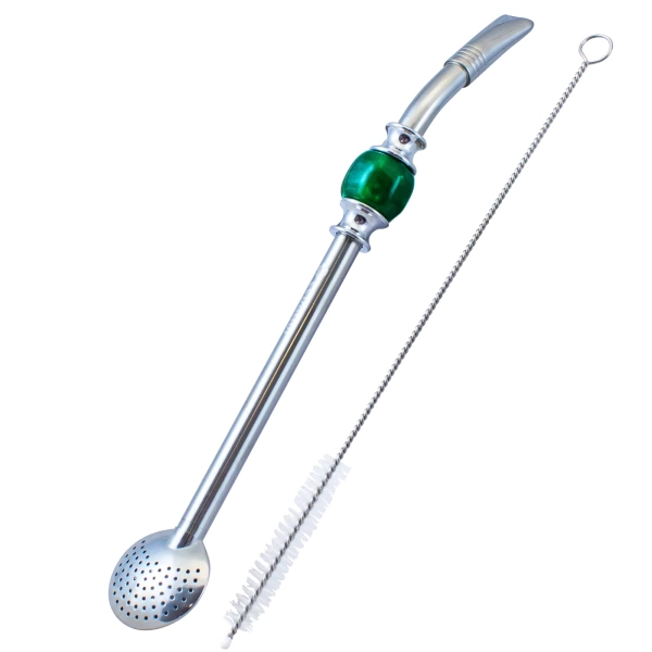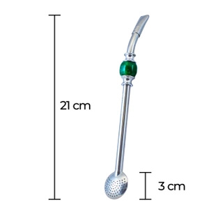 - Grote bombilla "Bomba" 22 cm voor yerba mate met een gekleurde koelsteen aan het mondstuk. Roestvrij staal zorgt voor duurzaamheid en weerstand tegen mechanische schade en hoge temperaturen. Eenvoudig ontwerp geeft elegantie en functionaliteit.